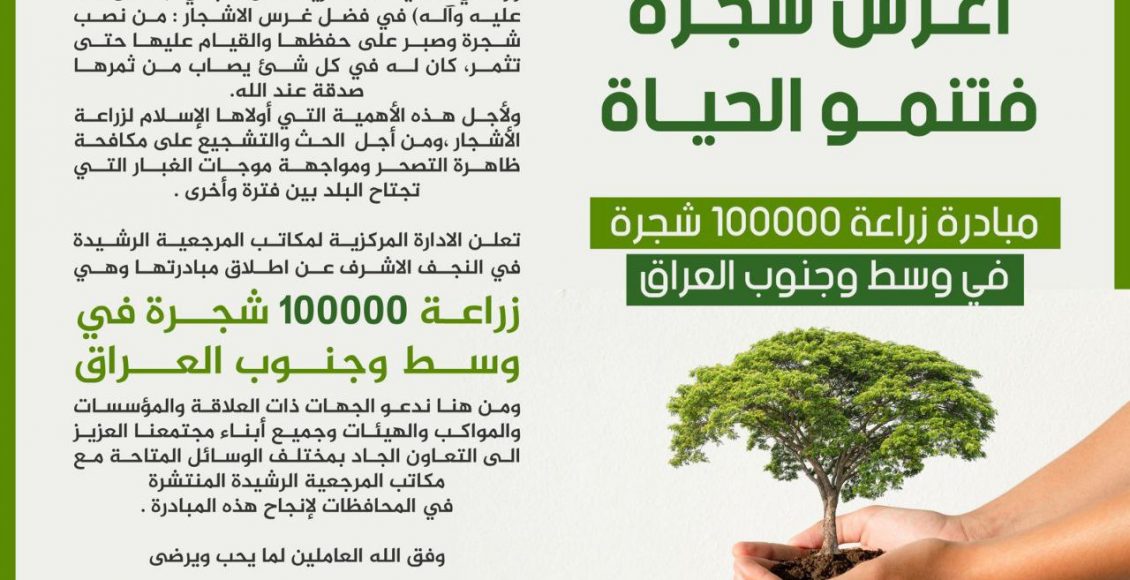 الادارة المركزية لمكاتب المرجعية الرشيدة في النجف الأشرف تتبنى مبادرة زراعة 100000 شجرة في وسط وجنوب العراق
