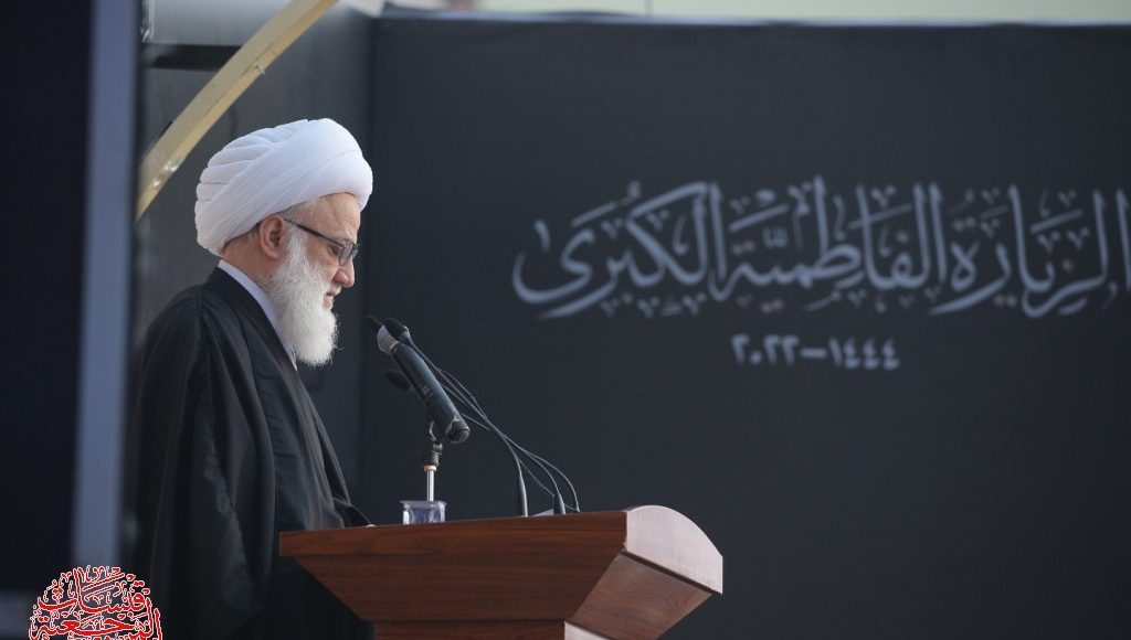 وأشار سماحتُهُ (دام ظله) في خطابه الفاطمي السنوي الذي يلقيه على الآلاف من زوار الأمام أمير المؤمنين (عليه السلام) بذكرى استشهاد السيدة فاطمة الزهراء بنت رسول الله (صلى الله عليه وآله وسلم) في 3 من جمادى الاخرة بساحة ثورة العشرين في النجف الاشرف()[1]الى حتمية مجيء اليوم الذي تسعدً فيه البشرية بإقامة دين الله تعالى وهيمنته على كافة الأنظمة والأيديولوجيات البشرية وحينئذٍ تنفتح البركات على نحو غير متصور كما اسهبت الروايات في ذكرها ووصف الحياة الطيبة والرغيدة والمرفهة التي يعيشها في ظل الدولة المباركة.