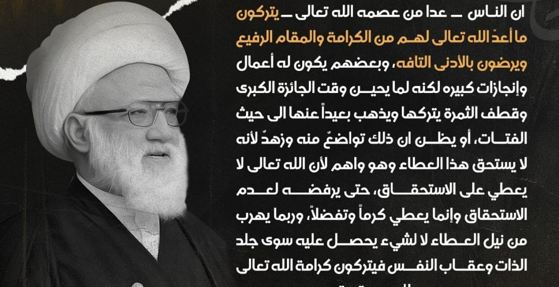 – ان الناس ــ عدا من عصمه الله تعالى ــ يتركون ما أعدّ الله تعالى لهم من الكرامة والمقام الرفيع ويرضون بالأدنى التافه، وبعضهم يكون له أعمال وإنجازات كبيره لكنه لما يحين وقت الجائزة الكبرى وقطف الثمرة يتركها ويذهب بعيداً عنها الى حيث الفتات، أو يظن ان ذلك تواضعٌ منه وزهدٌ لأنه لا يستحق هذا العطاء وهو واهم لأن الله تعالى لا يعطي على الاستحقاق، حتى يرفضه لعدم الاستحقاق وإنما يعطي كرماً وتفضلاً، وربما يهرب من نيل العطاء لا لشيء يحصل عليه سوى جلد الذات وعقاب النفس فيتركون كرامة الله تعالى ويطلبون عقوبته
