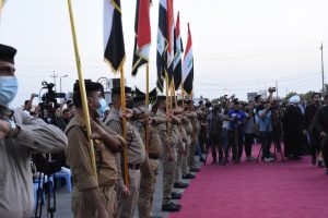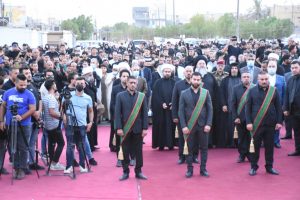 وذكر مسؤول ائمة الجمعة والجماعة السيد صادق الياسري خلال كلمته بالمجتمعين “نتشرف اليوم لان نضع ايدينا يداً بيد ونرفع راية البصرة الحسينية ونحن ننادي بقلوب ملؤها الايمان ومتلهفة لخدمة سيد الشهداء لبيك ياحسين لنعلن بذلك الولاء ونجدد البيعة تحت رايته المباركة ‘