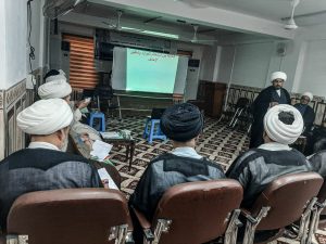ب ) المحور العملي التطبيقي : تميز بطابع التقسيم المجاميعي فقد نظم الشيخ المحاضر المتدربين على أربع مجاميع وطرح عدة أسئلة تستثير المتدربين وتظهر الطاقات الكامنة وتحفز الأذهان لإستخراج المخزون الفكري ومن ثم تنضيج الأفكار والرؤى المطروحة لتصبح خططًا مدروسة ومُبوبة .