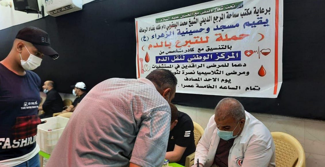 برعاية مكتب سماحة المرجع الديني الشيخ محمد اليعقوبي (دام ظله)بغداد الرصافة واشراف مؤسسة فيض الزهراء (عليها السلام) للأيتام والفقراء فرع بغداد الرصافة مكتب سبع قصور اقام مسجد و حسينية الزهراء (عليها) في سبع قصور حمله للتبرع بالدم بالتنسيق مع كادر طبي متخصص من المركز الوطني لنقل الدم لدعم المرضى الراقدين في المستشفيات ومرضى الثلاسيميا نصرة لثورة الحسين (عليه السلام).