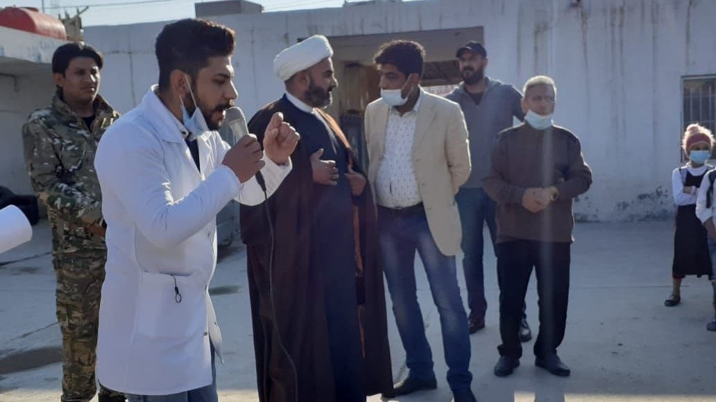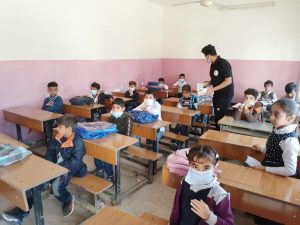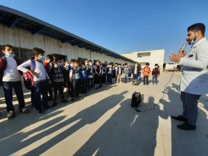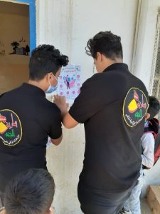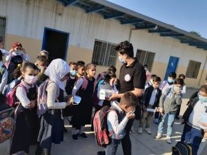 حملة توعية تستهدف المدارس في بغداد للوقاية من فايروس كورونا مع توزيع المستلزمات اللازمة لذلك.