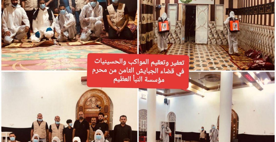 مؤسسة النبأ العظيم في قضاء الجبايش وبرعاية مكتب سماحة المرجع الديني الشيخ اليعقوبي(دام ظله) قامت بتعفير الحسينيات و المواكب التي تُقام فيها مجالس العزاء مع توزيع كمامات ومعقمات وجفوف وونشر بوستات  فيها إرشادات صحية وقائية.
