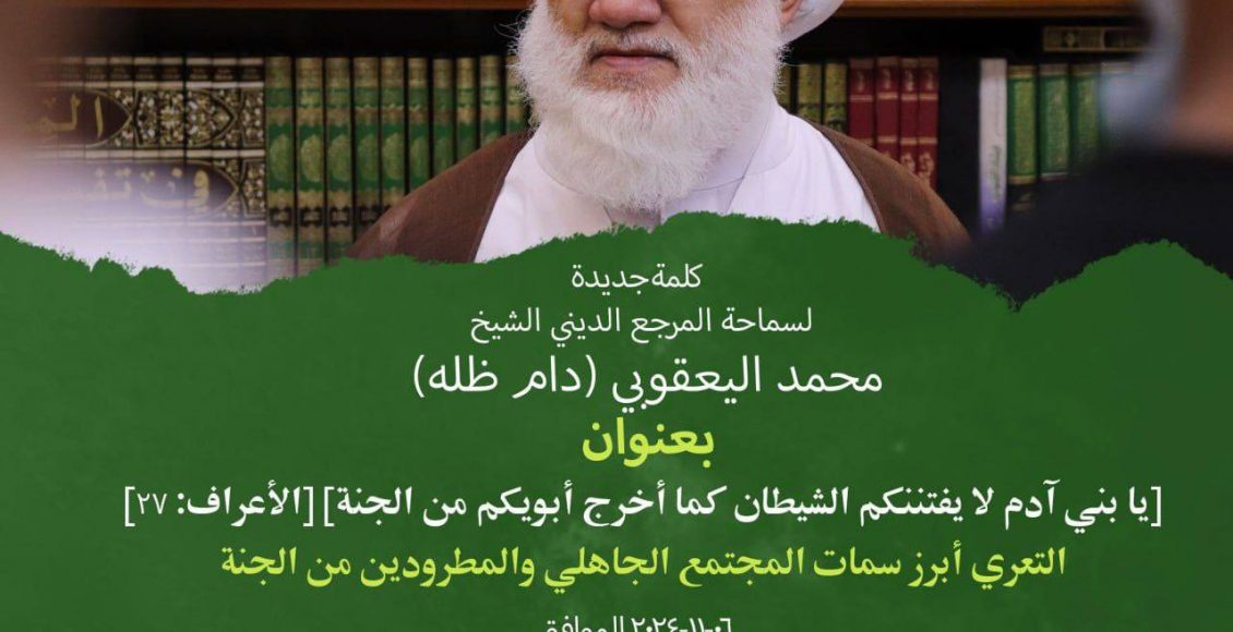 قبس من نور القران لسماحة المرجع اليعقوبي دام ظله من الاية 27 من سور الاعراف {يَا بَنِي آدَمَ لَا يَفْتِنَنَّكُمُ الشَّيْطَانُ كَمَا أَخْرَجَ أَبَوَيْكُمْ مِنَ الْجَنَّةِ} التعري أبرز سمات المجتمع الجاهلي والمطرودين من الجنة يوم الاربعاء 6-11-2024 الموافق 3/ج1/ 1446