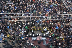 التشييع الذي شاركت به جموع غفيرة من اهالي البصرة المعزين انطلق من جامع المنتظر (عج) بمنطقة الكزيزة وصولا الى مكتب المرجعية الدينية في الجمعيات
