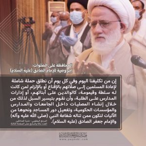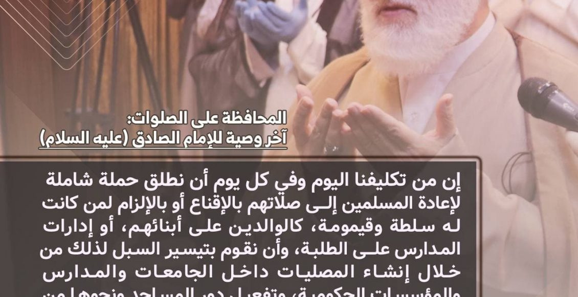 * إن من تكليفنا اليوم وفي كل يوم أن نطلق حملة شاملة لإعادة المسلمين إلى صلاتهم بالإقناع أو بالإلزام لمن كانت له سلطة وقيمومة، كالوالدين على أبنائهم، أو إدارات المدارس على الطلبة، وأن نقوم بتيسير السبل لذلك من خلال إنشاء المصليات داخل الجامعات والمدارس والمؤسسات الحكومية، وتفعيل دور المساجد ونحوها من الآليات لنكون ممن تناله شفاعة النبي (صلى الله عليه وآله) والإمام جعفر الصادق (عليه السلام).