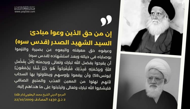 إن من حق الذين وعوا مبادئ السيد الشهيد الصدر (قدس سره) وعرفوه حق معرفته واتبعوه عن بصيرة والتزموا بوصاياه في حياته وبعد استشهاده (قدس سره) أن يفرحوا بفضل الله تبارك وتعالى وبرحمته [قُلْ بِفَضْلِ اللّهِ وَبِرَحْمَتِهِ فَبِذَلِكَ فَلْيَفْرَحُواْ هُوَ خَيْرٌ مِّمَّا يَجْمَعُونَ] (يونس:58) وأن يرفعوا رؤوسهم ويطاولوا بها السحاب لأنهم نهلوا من المعين العذب والمنبع الصافي فليشكروا الله تبارك وتعالى وليثبتوا على ما هداهم إليه .